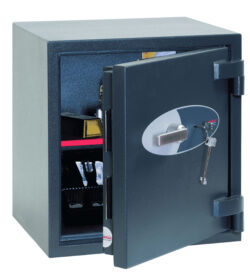 Dit model is voorzien van een stevig sleutelslot. De deur opent soepel en de binnenruimte biedt genoeg plaats voor dossiers, contant geld en andere waardevolle spullen. De robuuste constructie en het gewicht dragen bij aan de veiligheid.