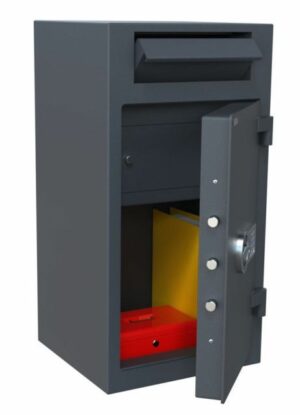 Deze ruime afstortkluis heeft een inhoud van 108 liter en is ideaal voor onder andere retail, restaurants en horeca. De kluis heeft een afstortklep van 105 x 295 x 130 mm (HxBxD) waardoor het mogelijk is om gemakkelijk grotere hoeveelheden contant geld in te werpen.